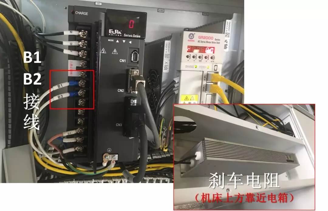 如果運行中,加減速過程中報警,我們就要檢查剎車電阻是否正常,先斷電,后拆下B1、B2接線,把萬用表調(diào)到電阻模式,測量B1和B2間的電阻值,正常范圍在75Ω-120Ω之間。(注意重新接線時不要接錯)