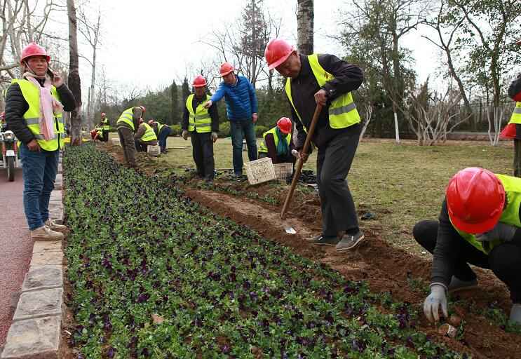 自2017年3月11日下午,由建設單位、市園林局、設計單位、監(jiān)理單位、施工單位根據現場實際情況確定施工方案后,濟南黃河路橋建設集團有限公司立即組織人員、材料、機械進場為施工做準備,當晚七點進場施工人員15人,小型挖掘機一臺,對施工區(qū)域種植土進行整理深耕,為栽植苗木做準備。當天夜間100000株時令花卉進場(三色堇、雛菊),同時組織260余名施工人員對進場時令花卉進行栽植。