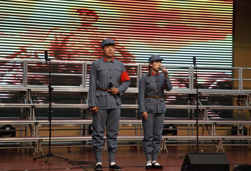 ?? 紅歌會(huì)活動(dòng)現(xiàn)場(chǎng),《鼓浪嶼之波》《歌唱祖國》《山丹丹開花紅艷艷》《我愛你中國》《我和我的祖國》《祖國不會(huì)忘記》《天耀中華》等十七首經(jīng)典愛國歌曲輪番上演,歌聲在會(huì)場(chǎng)上空飄蕩。集團(tuán)公司現(xiàn)場(chǎng)合唱的是紅色經(jīng)典歌曲《在太行山上》。歌曲由三個(gè)部分組成。第一部分為詩歌朗誦。表達(dá)了抗戰(zhàn)時(shí)期中國軍民艱苦卓絕的奮斗歷程和大無畏的革命樂觀精神;第二部分為情景表演。描繪了八路軍戰(zhàn)士們?cè)趹?zhàn)場(chǎng)上揮舞著紅色旗幟,在沖鋒的號(hào)聲中,向敵人的陣地發(fā)起沖鋒,受傷的戰(zhàn)士在衛(wèi)生員和戰(zhàn)友的攙扶下在戰(zhàn)場(chǎng)上繼續(xù)前進(jìn)的場(chǎng)景。第三部分為歌曲合唱。演員們身著八路軍軍裝,精神抖擻,情緒高昂,歌聲嘹亮,仿佛把大家?guī)肓藨?zhàn)火紛飛的年代,給人以催人奮進(jìn),所向披靡的力量,兩個(gè)聲部相互配合,高低呼應(yīng),逐步將歌曲推向高潮。