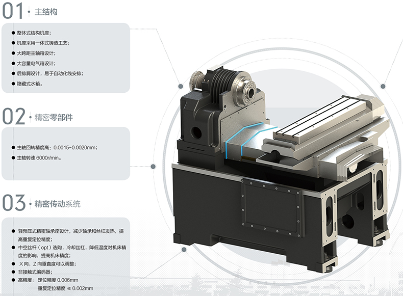 三、X、Z軸采用進(jìn)口直線(xiàn)導(dǎo)軌及滾珠絲杠,運(yùn)行速度快,精度高,使用壽命長(zhǎng);絲杠軸承為獨(dú)立安裝、單獨(dú)裝配及調(diào)整,采用排刀架,換刀速度快,精度高,故障率低。機(jī)電一體化設(shè)計(jì),操作、維修方便;獨(dú)立大水箱及鐵屑箱,可將鐵屑迅速排出。